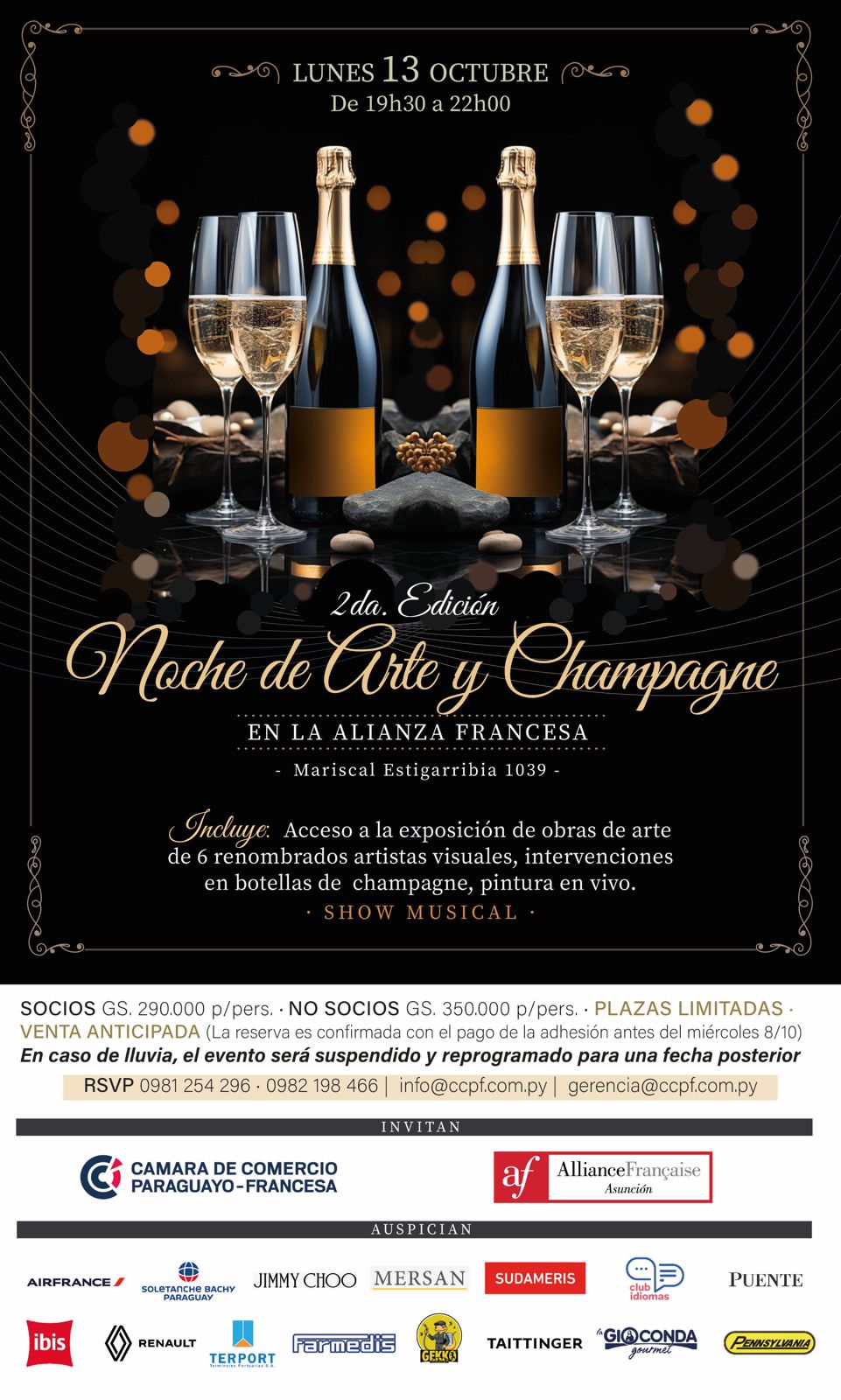 La Cámara de Comercio Paraguayo-Francesa, en colaboración con la Alianza Francesa de Asunción, presenta la segunda edición de la “Noche de Arte y Champagne”, un encuentro que celebra la unión entre Francia y Paraguay a través del arte, la cultura y la gastronomía.